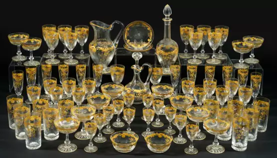 79-tlg.; Bestehend aus Schenkkanne, 2 Karaffen mit Stöpseln, 4 Schälchen, 12 Rotwein-, 12 Weißwein-, 12 Südwein-, und 12 Wassergläsern, 12 Champagnerschalen und 12 Sektflöten. Farbloses Kristallglas, geschliffen. Fuß mit Bodenstern, größtenteils mit facettiertem Schaft und glockenförmiger Kuppa. Geätzte und vergoldete Bordüre mit Rocaillen und Blütenzweigen. Teilw. mit Firmen-Etikett. H. 12 cm-35,5 cm. Schälchen-D. 11,5cm-15 cm.