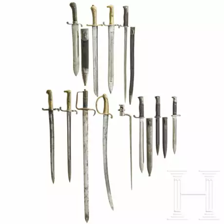 Bayerischer Infanteriesäbel, an der Rückenklinge beidseitig die geätzte Chiffre "CT" unter Kurhut (Kurfürst Carl Theodor), später ergänztes Briquetgefäß. Pionierfaschinenmesser M 71 mit Gladiusklinge ("Gebr. Weyersberg"). Ein zusammengestelltes, gekürztes Faschinenmesser ohne Marken mit Messinggefäß M 1830. Ein SG M 71 von "Weyersberg & Stamm Solingen", am Klingenrücken "W 76" unter Krone, Parierstange mit Truppenstempel "E.16.2.". Ein Yatagan zum württembergischen Landjägergewehr M 71, an der stellenweise narbigen Rückenklinge der undeutliche Herstellerstempel "Weyersberg, Kirschbaum & C(o), Solingen", Parierstange mit Truppenstempel "K.L.K.636.". Dazu ein SG 98 lang von "W.K & C" in Lederscheide (verzogen, Knick). Ein SG 98/05 von Simson & C, Suhl ("W 16" unter Krone), Gefäß und Eisenscheide narbig. Ein SG 84/98 mit Bakelitgriffschalen, an der brünierten Scheide der Code "42 cof", an Knauf und Scheide WaA-Stempel. Ein sächsisches SG 71/84 von "Weyersberg, Kirschbaum & Co, Solingen" ("AR 87" unter Krone, Truppenstempel "106. R. 1.9."). Außerdem ein dreikantiges Tüllenbajonett und ein ziviler Hirschfänger (Kingenmarke "J.D.Dominicus & Soehne") mit Horngriffschalen und Lederscheide. Weiterhin ein Phantasie-Pallasch mit zweischneidiger Klinge (Passauer Wolf) und Eisen-Bügelgefäß (rostig). Arretierungen intakt. Teilweise leicht beschädigt, Gebrauchs- und Altersspuren. Länge 37,5 - 90 cm.