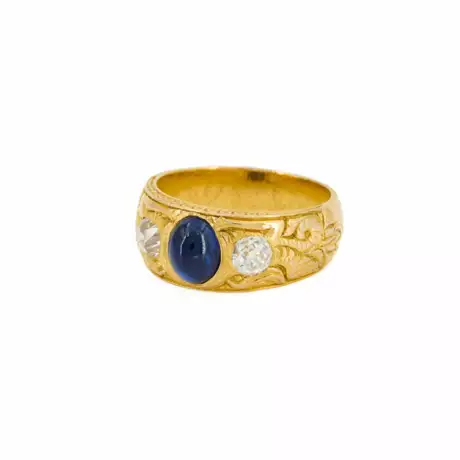 Description: Solidly crafted band ring with engraved ornamental decorations, featuring an oval sapphire