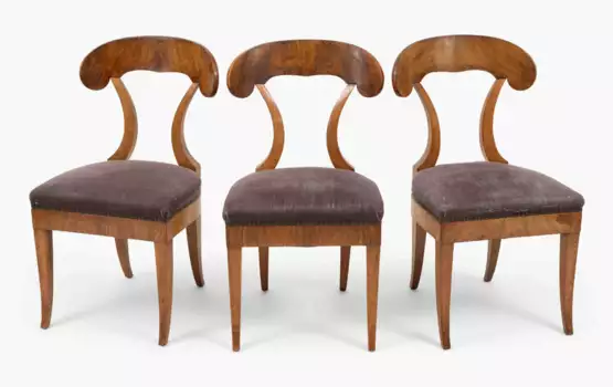 Um 1830, Biedermeier. Nussbaumholz. Trapezförmige, seitlich abgerundete Zarge mit Polstersitz auf Säbelbeinen. Geschweifte, schaufelförmige Rückenlehne. 45 x 48, Höhe 86 cm.