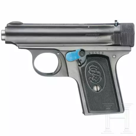 Cal. 6,35mmBrowning, SN. 49113, nicht nummerngleich. Blanker Lauf, Länge 62 mm. Beschuss Krone, "N". Standardbeschriftung am Verschluss. Originale Brünierung mit geringen Tragespuren. Schwarze Kunststoffgriffschalen. Magazin, links gemarkt "S&S 6.35".