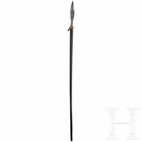 The broad blade of diamond section, both sides with finely etched Saxon Electorate coat of arms and decorative tendrils on a finely stippled background. Conical socket with renewed staghorn toggle. Sturdy, lightly conical tapering shaft (slightly warped) with finely chased scales. Length 227.5 cm.