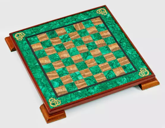 A Russian malachite, agate and marble chessboard with gilt silver applications and wooden frame. Standard mark 84.