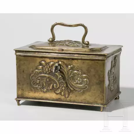 Rechteckige Schatulle aus Messingblech auf vier kleinen Füßen, die beiden vorderen ergänzt. Allseitig getriebener Ranken- und Rocaillendekor, der scharniergelagerte Deckel mit beweglichem Tragegriff. Abschließbar, originaler Hohldornschlüssel mit durchbrochen gearbeiteter Reide liegt bei. Die Innenseite verzinnt, mit Trennwand unterteilt. Maße 12 x 16,5 x 11 cm.