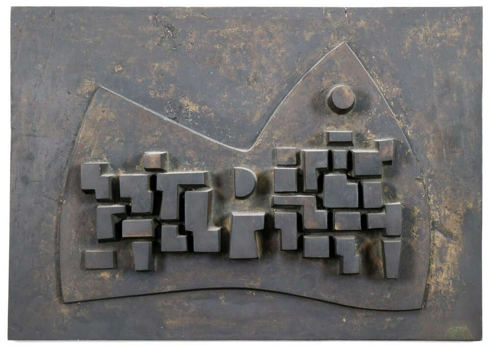 Bronzerelief 20.Jh, Hannover. Kubistisches Bronzerelief, 22,5 x 32 x 2,5 cm. Gew. 6,76 Kg. Rückseitig Etikett mit Bez. Kilian Schirmer "Pattensen".