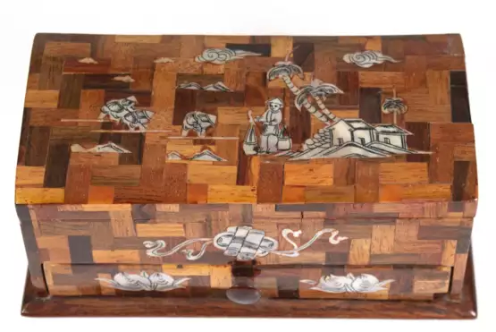 Lot 586 | Schmuckschatulle, aus diversen Hölzern zusammengesetzt, leicht gewölbter Deckel und Front mit figürlichen und floralen Perlmuttintarsien, Schublade mit Holzfehlstelle, Deckel innen verspiegelt, 8x19,5x10 cm