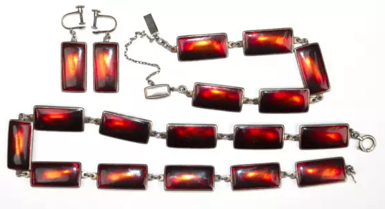 Schmuckset wohl 1930/ 40 bestehend aus Collier/ Halsband ca. 38 cm, Armband ca. 20 cm, Paar Ohrringen mit Schraubverschlüssen, alle Glieder punziert, ca. 85,9 g, rote Emaille, leichte Gebrauchsspuren