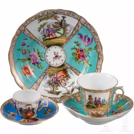 Porzellan, farbig staffiert und partiell vergoldet. Schokoladentasse (ohne Deckel) mit vierpassiger Untertasse und Teller mit partiell türkisfarbenem Fond. Mokkatasse und Untertasse mit blauem Fond. Alle Teile jeweils mit zwei figürlichen und zwei floralen Kartuschen. Tassen und Untertassen mit Monogrammmarke AR, Teller mit Schwertermarke mit zwei Schleifstrichen. Durchmesser Teller: 19 cm, Länge UT: 13,5 bzw 11,3 cm, Höhe Tassen: 7,3 bzw 4,3 cm