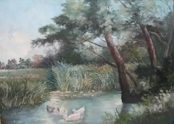 (20. Jh.). Schilfumstandener Teich mit Enten am Waldrand. Öl auf Hartfaser, wohl 2.H. 20. Jh. 60 x 80 cm. Unt. li. sign. gerahmt (nicht ausgerahmt).