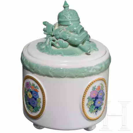 Weißes, glasiertes Porzellan, bunt bemalt. Auf dem Deckel plastische Komposition mit militärischen Gegenständen, u.a. Pickelhaube, Fahne, Säbel, Patronengurt. Auf der Wandung insgesamt vier goldene Medaillons mit handbemalten Blumen, reliefiertes grünes Eichenlaubband. Im Boden die blaue Zeptermarke bzw. die rote und blaue Reichsapfelmarke, zwei Eiserne Kreuze, undeutliches Monogramm (geritzt) in Unterglasur. Kleine Bestoßungen am Doseninnenrand, Schwertgriff, Helmspitze und Fahnenspitze restauriert. Gesamthöhe ca. 20 cm.