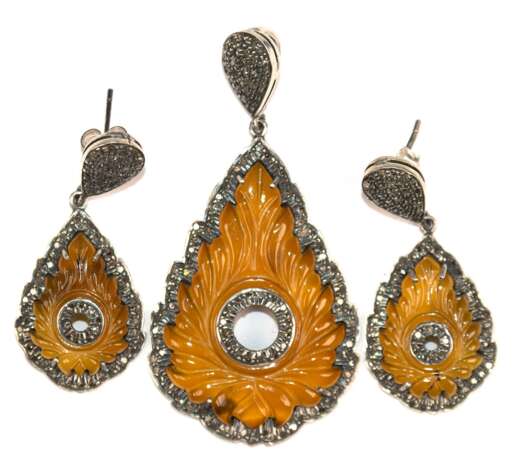 Lot 943 | Set aus Ohrringen und Anhänger, Silber geprüft, gelbe Saphire ca. 30,8 ct., mit geschnittenen Dekor, Diamanten ca. 1,8 ct.