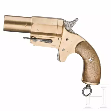 Kal. 4 (Signal), Nr. 3781, blanker Kipplauf, Länge 102 mm. Links am Rahmen signiert "G G & Cie" (Grivolat, Gerest & Cie). Lauf mit Rahmen Messing, Bedienteile Stahl, mit leichten Närbchen. Nussholzgriffschalen. Fangring. Gesamtlänge 195 mm.