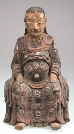 Lot 325 | Skulptur "Sitzender Buddha", Holz geschnitzt, alte polychrome Fassung mit aufgesetzten Glasplättchen, rücks. ovale Aushöhlung, Gebrauchspuren, H. 45 cm