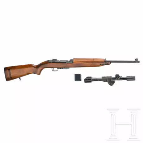 Kal. .30Carbine, Nr. 341570, blanker Lauf. Klappdiopter-Visier fehlt. Kornschutzbacken. Überarbeitet, gute Brünierung, lackierter Nussholzschaft, Schaftdurchbruch verschlossen. Zwei 2er-Magazine, tauschbar. Oberseite des Handschutzes für die Montage eines ZF angefräst. Dazu ein Zielfernrohr für Garand M1, gemarkt "TELESCOPE / M84 / Serial No. 24903" (Vergrößerung zweieinhalb), mit Regenschutzrohr und Halterung. Länge 91 cm.