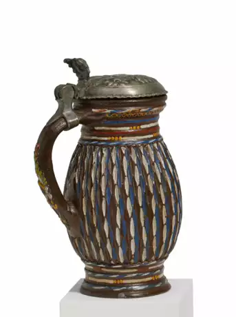 Technique: Brown stoneware, salt-glazed, polychrome enamel decoration, discreetly enriched in gold, tin mounting.