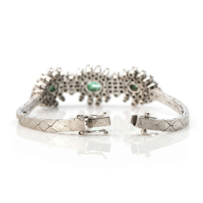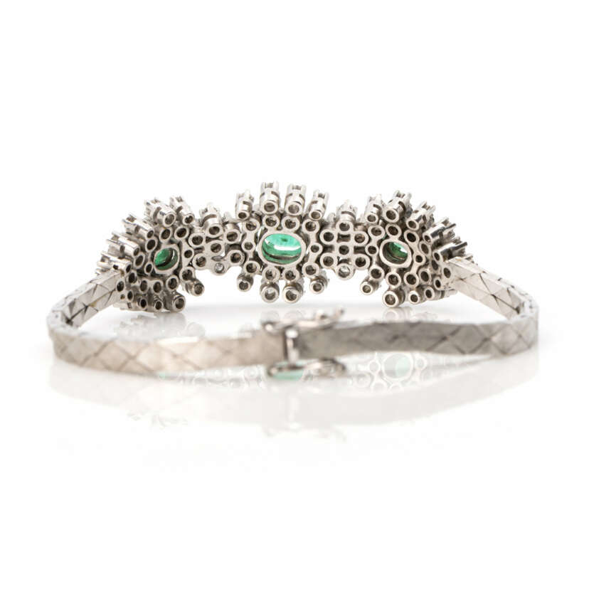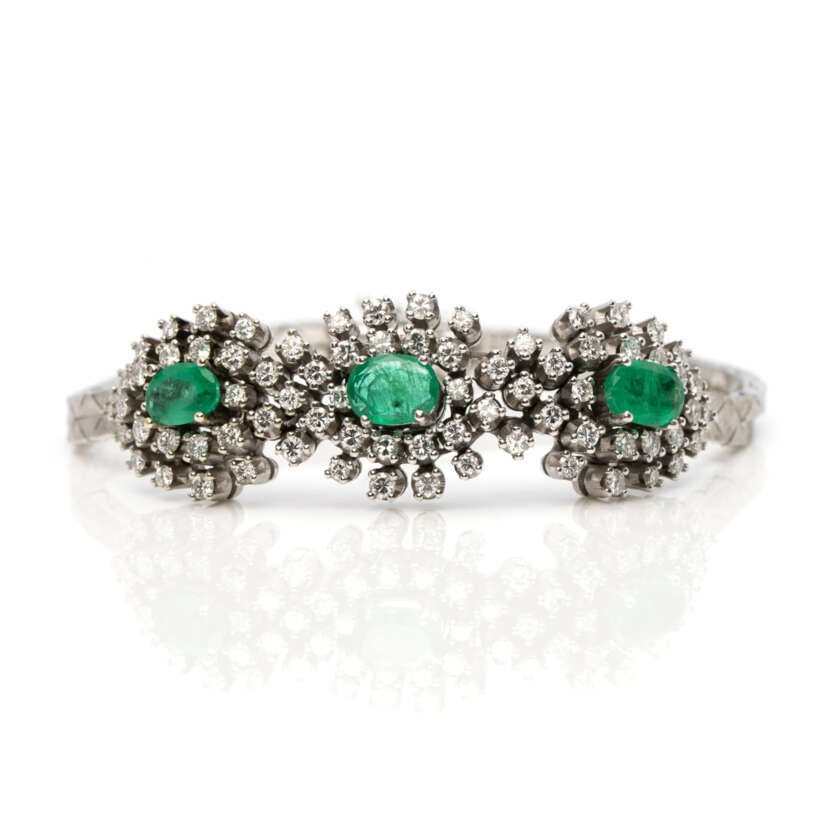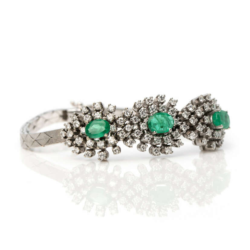 Circa 1960, 585 white gold, hallmarked, three brilliant-cut emeralds, total approx. 2.25 ct, surrounded by 76 brilliant-cut diamonds, VSI-SI, H, length approx. 16.4 cm, total weight approx. 24.6 g