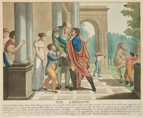 Umfasst: Die Abreisse(!) - Der Ruin - Das Elend - Die Reue - Die Verzeihung. - Im Milieu der deutschen Romantik angesiedelte Bildergeschichte in Anlehnung an die biblische Erzählung, mit gestochenem mehrzeiligem Text unter jedem Bild. Alle Blätter bis zum Bild- bzw. Textrand beschnitten und aufgezogen (Verlust der Verlagsadresse und allfälliger Künstlersignaturen).