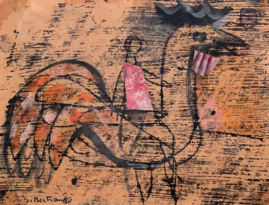 Solange, Bertrand (1913-2011, französischer Maler, Bildhauer und Kupferstecher) "Ohne Titel", Mischtechnik/ Collage, sign. u.l., 20,5x26 cm, im Passepartout hinter Glas und Rahmen