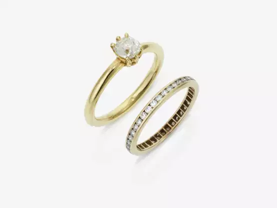 Solitaire ring: yellow gold 585/-, assayed, eternity ring: yellow gold 585/-, assayed. 1 old-cut diamond, 0.66 ct., slightly toned white, L, VS2, approx. 38 small octagonal-cut diamonds totalling approx. 0.25 ct., slightly toned white, VS 1-2. In good to very good condition. Ringsize: Solitaire ring: 57, eternity ring: 53.5. 5.13 g.