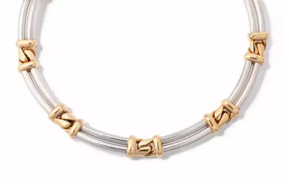 Nach 1980. 750 Gelb-/Weissgold. Massives Tour de Cou aus doppelten, leicht bogenförmigen Weissgoldgliedern, verbunden mit gelbgoldenen Panzerketten. L ca. 40 cm, B 1,2 cm. 165 g.