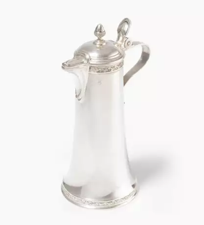Silber. Herstellermarke Jezler. Konischer Korpus mit Schnabelausguss und Bogenhenkel. Mit Drücker und Eichel als Deckelknauf. Herstellermarke, Feingehalt 800. H 24,5 cm, ca. 545 g.