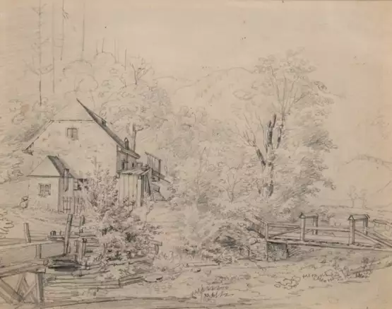 Stocks, Minna (1846 Schwerin-1928 Hinzenhagen b. Lalendorf, Mecklenburg) "Walmdachhaus am Bachlauf", Bleistiftzeichnung, rückseitig Nachlaßstempel, 18x22,5 cm, hinter Glas im Passepartout und Rahmen (Deutsche L…