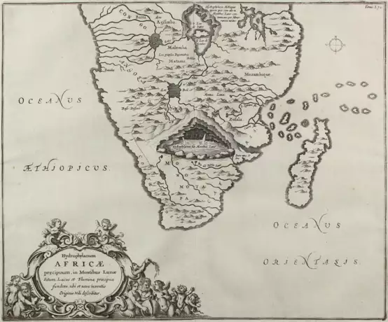 Norwich 157: "Showing sources of the Nile in a cavern beneath the Mountains of the Moon". - Fascinating map of the southern part of Africa showing the fountains of the Nile located in an underground cavern beneath the Mountains of the Moon.