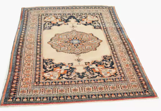 NW-Persien, um 1900. Auf cremefarbenem Grund tritt ein eindrucksvolles Zentralmedaillon mit 2 Anhängern hervor, umgeben von 4 grosszügig angelegten, nachtblauen Eckzwickeln, die mit orangefarbenen Ranken und weissen Blättern dekorativ belegt sind. Mehrere Nebenbordüren umfassen die ebenfalls cremefarbene, mit Palmetten und Wellenranken üppig verzierte Hauptbordüre. Leicht fleckig, minimale Gebrauchsspuren. 135x178 cm (ft. 4.5x5.9).