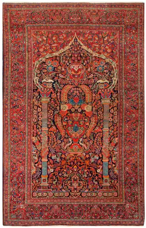 Persien. Wolle auf Baumwolle. Auf dunklem Fond passig geschweifte Reserve mit großem Vasenmotiv sowie Musterung aus üppigen Blütenrispen. Umlaufend breite Bordüre aus wellenartig angelegtem Blattwerk und Blüten. 191 cm x 139 cm.