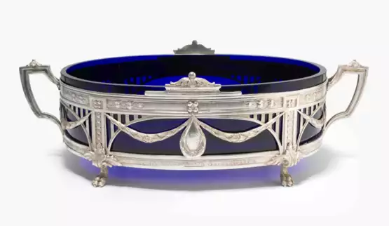 Silber/Glas. Meistermarke Weinranck & Schmidt. Ovale, dunkelblaue Glasschale in Silbermontierung. Halbmond/Krone, Meistermarke, Feingehalt 800. L 40 cm.