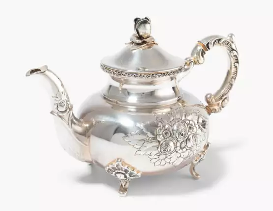 Silber. Meistermarke Emil Hermann. Gebauchte Form auf Volutenfüssen. Deckelknauf in Form einer Rosenknospe und rocaillenförmiger Henkel. Wandung mit reliefiertem Rosendekor auf Blattbeet. Halbmond/Krone, Meistermarke, Feingehalt 925. H 18 cm, ca. 710 g.