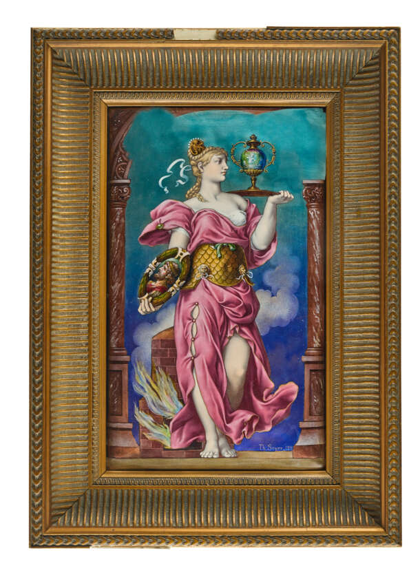 This plaque, depicting an allegory of enamelling, likely belongs to a series Théophile Soyer devoted to the decorative arts. This hypothesis is supported by a comparable enamelled plaque representing the allegory of goldsmithing, after a model by François Émile Ehrmann, now in the musée d’art et d’histoire de Genève. The exhibition catalogue Les Soyer: une dynastie d’émailleurs (Galerie Marc Maison, 2005, cat. 8) also records and illustrates a plaque on the same allegorical theme. Here, enamelling is personified as a young woman holding, in one hand, a Renaissance-style enamelled portrait medallion and, in the other, a covered vase, while a flaming kiln rises behind her.