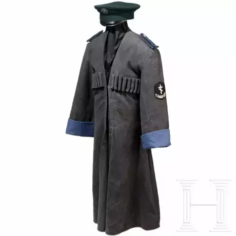 Knielanger schwarzer Mantel mit aufgeschlauften Schulterstücken, blauen Aufschlägen und Futter, ein Ärmelabzeichen des Stabes des Generals von Pannwitz und eines mit dem orthodoxen Kreuz und kyrillischer Aufschrift "Gott mit uns". Qualitätsvolle Anfertigung, möglicherweise eines Traditionsvereines in den 1950er Jahren. Dazu eine Schirmmütze für königlich bayerische Forstbeamte und eine Tischglocke(?) mit Chiffre "GR".