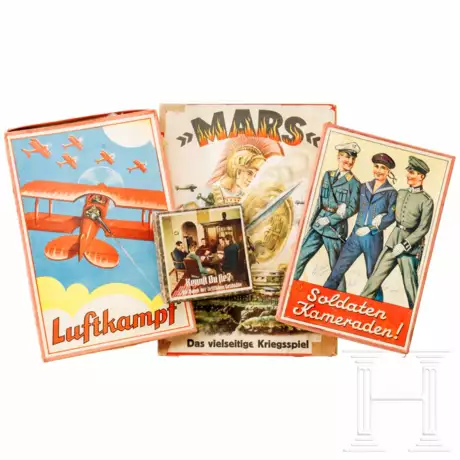 Brettspiel "Mars - Das vielseitige Kriegsspiel", Brettspiel "Soldaten Kameraden!", Brettspiel "Luftkampf" und das Quiz "Kennst Du Sie? ... die Daten der Deutschen Geschichte". Nicht auf Vollständigkeit geprüft. Alters- und Gebrauchsspuren.