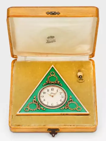 im Stil von Karl Fabergé. Silber, vergoldet und teilw. emailliert, Gold. Dreieckige Schauseite. Zentral eingelassene Uhr mit guillochiertem, weiß emailliertem Ziffernblatt mit arabischen Zahlen und vergoldeter, mit Diamantrosen besetzter Lünette, umgeben von grün emailliertem und wellenförmig guillochiertem Grund. Die Ecken verziert mit applizierten, zu Achten gewundenen Lorbeerzweigen und Schleifenbändern. Lünette und Schauseite profiliert mit schmalen, weiß emaillierten Rahmen. Rücks. Aufsteller und Aufzug. Zifferblatt bez. "Faberge". Schlüssel. Originalbox. Gest. 56, 88. H. 10,5 cm.