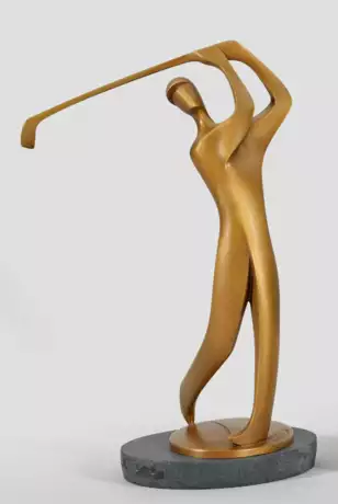 Bronze, patiniert und poliert. Auf ovale Plinthe aus poliertem, anthrazitfarbenem Stein montiert. Sign., dat. 2014 und nummeriert 2/199, Gießerstempel Edition Strassacker. Golfer in typischer Rotationshaltung nach dem Abschuss in der Endposition und dem nach dem Treffmoment in einem großen Bogen hinter den Kopf verlagerten Schläger. Nach dem Wachsausschmelzverfahren wurde die Bronzestatuette vom Künstler ziseliert und patiniert. H. 17,3 cm.