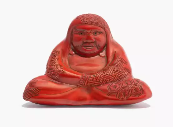 Japan, 19.Jh. Rotlack, geschnitzt. Sitzender Daruma, in seinen Mantel gehüllt. H 3 cm.