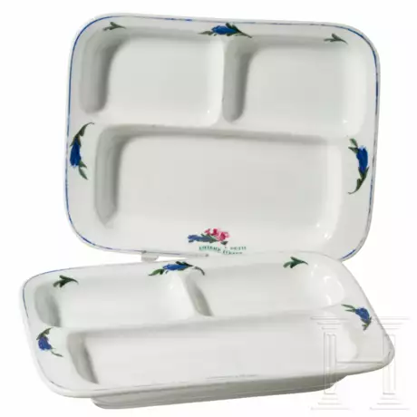 Weißes, glasiertes Porzellan mit farbigem Alpenblumendekor und entsprechender Aufschrift. Im Boden "Bauscher Weiden" und "Albert & Lindner - München - Fabrikdekor". Sichtliche Gebrauchsspuren, Maße ca. 27 x 22 cm.