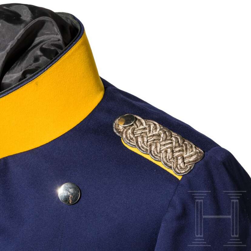 Feines dunkelblaues Wolltuch mit gelben Vorstößen, Aufschlägen und Stehkragen, eingenähte geflochtene Schulterstücke für einen Major, zwei Reihen blanker Eisenknöpfe ("A. Berger Potsdam"). Schwarzes Seidenfutter, im Kragenbereich das Schneideretikett von Berger, Potsdam, in der Brustinnentasche das Trägeretikett von "Fürst Otto zu Salm Horstmar" mit Datierung "16. XII. 07". Leichte Trage- und Altersspuren. Offiziersqualität, außergewöhnlich schöne farbfrische Erhaltung.