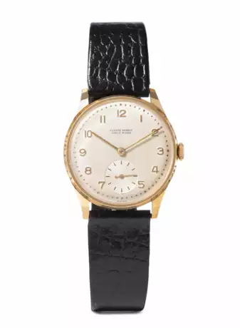 750 Gelbgold-Gehäuse, Nr. 653267. 33 mm, Gehäuseboden mit Widmung. Handaufzug Kal. Versilbertes Zifferblatt mit aufgesetzten goldenen, arabischen Zahlen und Zeiger. Kleine Sekunde bei 6 Uhr. Schwarzes Lederband mit Dornschliesse. Funktionstüchtig.