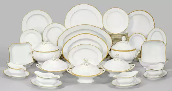 79-tlg.; 24 Speiseteller, 12 Suppenteller, 12 Brotteller, 11 Salatteller, 7 verschieden große Anbietplatten, 4 verschieden große Gemüseschalen, 2 Deckelterrinen, 3 Deckelschüsseln, 4 Saucieren fest auf Untersatz. Form "Englischglatt". Altweiß glasiert. Goldstaffage. Zwei Saucieren, teilw. mit schwarzer Kontur, später passend erg.; Wenige minim. best./rest.; Zepter- und Malereimarke. Größte Anbietplatte 50 cm x 36,5 cm. Terrinen-H. 25 cm. B. 30 cm.