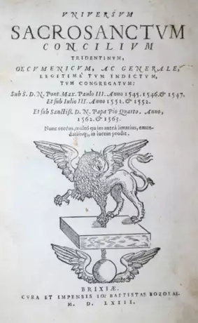 Graesse II, 37. Adams C2792. Erste Ausgabe mit dem Egebnissen aller 25 Sessionen v. Papst Paul III bis Pius IV herausgegeben v. Joannes Baptista Bozola. - Tls. etw. fleckig, gegen Ende auch wasserrandig, Ebd. etw. fleckig u. bestoßen.