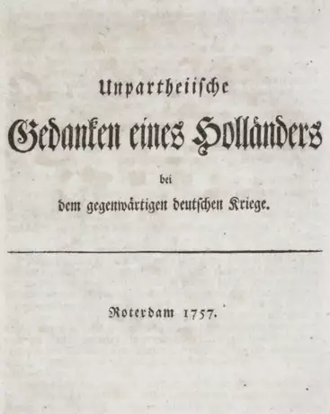 VD 18, 1446487X-001. Nicht bei Holzmann-B. - Im gleichen Jahr ersch. eine Ausgabe mit leicht abweichendem Titel ("Unpartheyische") in Bückeburg (40 S.). - Tls. leicht stockfleckig. - ╔Dabei:╗ Kurze Anmerkungen über einige Schreiben den gegenwärtigen Zustand in Sachsen betreffend. O.O.u.Dr. (1757). Kl.4°. 4 Bl. Ohne Einband, ausgebunden. - VD 18, 11089822. - Etw. stockfleckig. - ╔Süßmilch,J.P.╗ Der größte und herrlichste unter allen bisherigen Siegen, welchen das Königliche Preußische Heer am 6ten May 1757. bey der Böhmischen Hauptstadt Prag unter Göttlichem Beystande erfochten, wurde nach seinen edlen Früchten und Wirkungen der Gemeine zu S. Petri in Cölln in der verordneten Dank-Predigt vorgestellet. Bln., o.Dr. 1757. Kl.4°. 16 S. Ohne Einband, ausgebunden. - Diese Ausg. nicht im VD 18 (nur Berliner Drucke bei Grynaeus und Decker). - Etw. fleckig. - ╔(Steck,J.C.W.v.)╗ Abhandlung von Abruffung der in auswärtigen Kriegs-Diensten stehenden Reichs-Glieder und Vasallen, mit beygefügten Anmerkungen. O.O.u.Dr. 1757. Kl.4°. 22 S., 1 w. Bl. Ohne Einband,ausgebunden. - VD 18, 90234138. Druckvariante mit Bogensignatur A3 (statt B) auf S. 5, vgl. KVK.