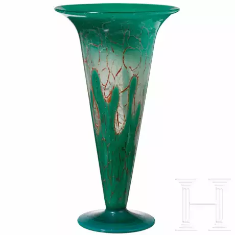 Farbloses Glas, grün unterfangen. Zwischen den Schichten Farb- und Oxydeinschmelzungen. Auf rundem Fuß. Stark ansteigende Wandung mit ausgestelltem Rand. Höhe 27 cm.