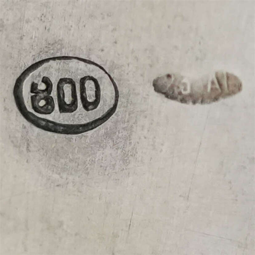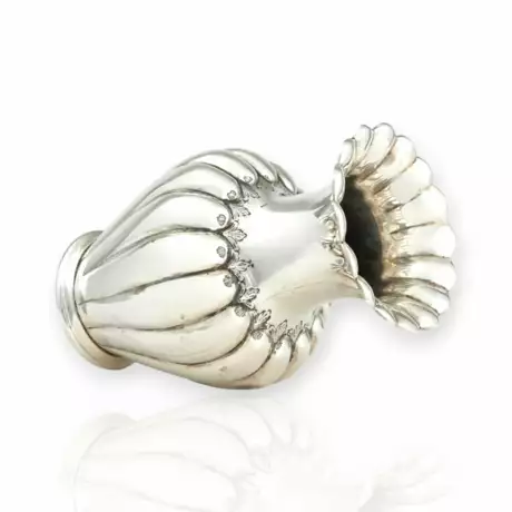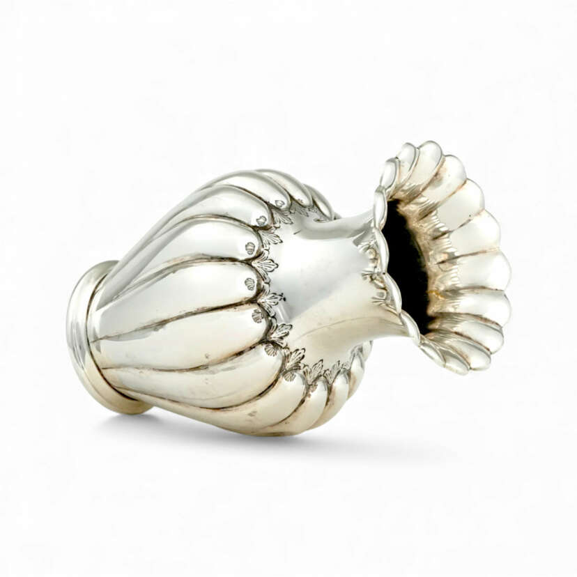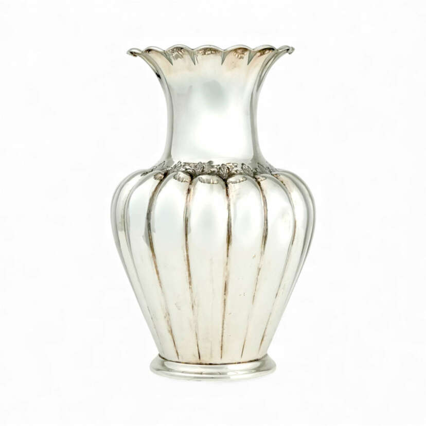 Italy, Alexandria municipal mark, 1920s, fineness 800 silver, hallmarked, vase with scalloped rim, round body with engraved leaf frieze around the circumference, height 23.5 cm, total weight approx. 523 g, dent, signs of polishing and wear