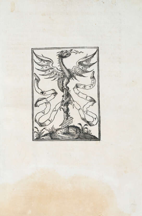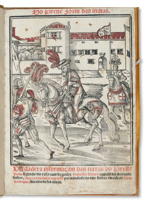 Folio (264 x 184mm). Title printed in red and black and with a full-page woodcut depicting Prester John and his entourage outside a walled town, woodcut printer's device on final leaf (title soiled and slightly trimmed, ink stain to F4-5, dampstain to lower margin of index, encroaching to text on 5 leaves). Modern vellum with ties, slipcase (erasures to vellum). Provenance: Bent Juel-Jensen, 1922-2006 (bookplate in Amharic).