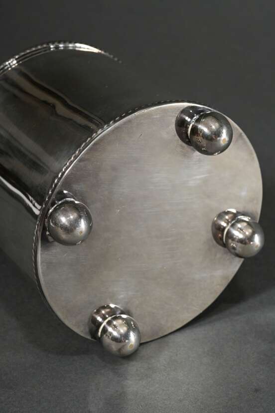 Silver-plated cylindrical tea caddy on ball feet, England, 19th century, height 12.5 cm