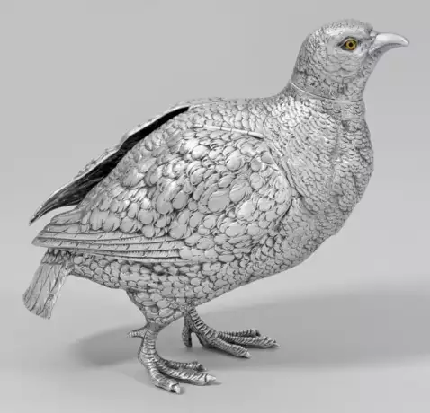 Silber. Vollplastisch gestaltete Skulptur einer Wachtel mit scharnierten, beweglichen Flügeln und abnehmbaren Kopf. Naturalistisch und detailliert reliefiertes Gefieder und farbige Glasaugen. Gest. 800. Gew. ca. 585 g. H. 17,5 cm.