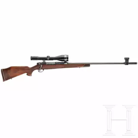 Cal. .378WeathMag, SN. H84395, blanker Lauf, Länge 65 cm. Lauf mit abnehmbarer Mündungsbremse, Kornsattel mit Korntunnel und Balkenkorn. Gültiger Beschuss von 1967. Lauf und System mit vollständiger Brünierung. Hülse seitlich gemarkt "Weatherby Mark V". Zylinderverschluss mit neun Verriegelungswarzen. Abzug mit Canjar-Trigger nachgerüstet. Nussholzschaft mit Fischhaut, Pistolengriff, langgezogener deutscher Backe und Monte-Carlo-Effekt. Breite ventilierte Schaftkappe. Abstand Abzug - Schaftkappe 36 cm. Montiert mittels Schwenkmontage ein ZF Zeiss Diatal-Z 8 x 56, Abs. 4. Gesamtlänge 127 cm.