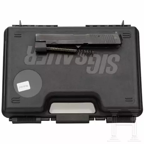 Cal. 9mmLuger, SN. G232179D, Verschlussträger und Lauf nummerngleich. Blanker Lauf. Dt. Beschuss. Schließfeder. In originaler schwarzer SIG Sauer-Kunststoffbox.